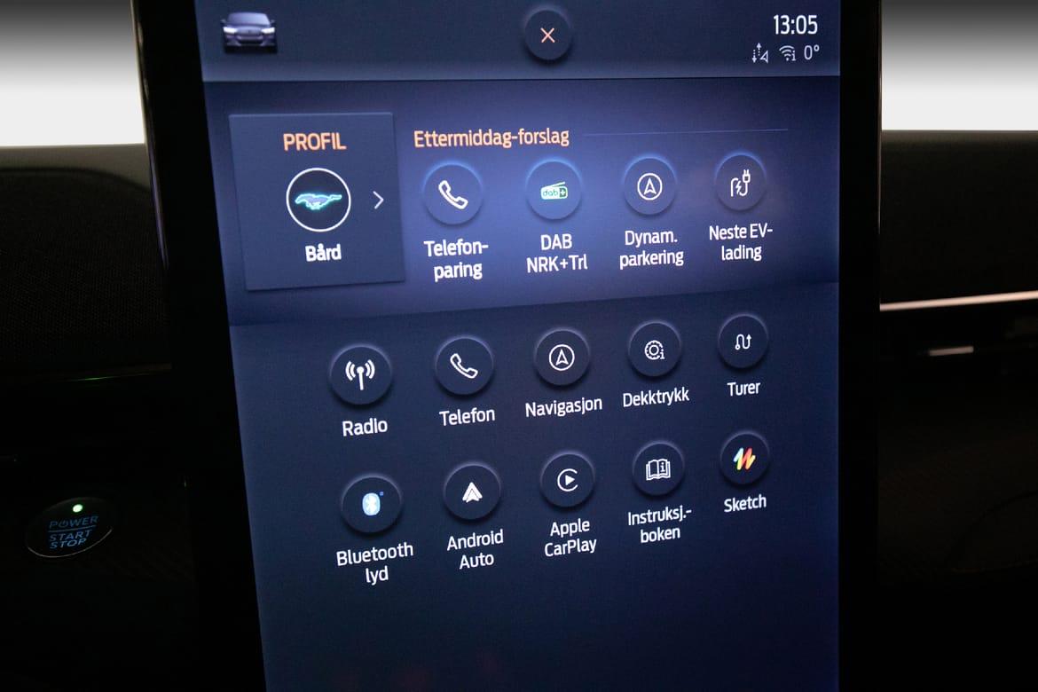 Ford SYNC 4A og FordPass Connect sørger for at du alltid er tilkoblet, med rask respons, oversiktlige menyer og smarte funksjoner som gjør kjøringen enklere. Mach-E er samtidig svært praktisk i bruk: 402 liter bagasjeplass bak og en praktisk drenert frunk gir god plass til hverdagens utstyr, handleposer eller sportsutstyr.